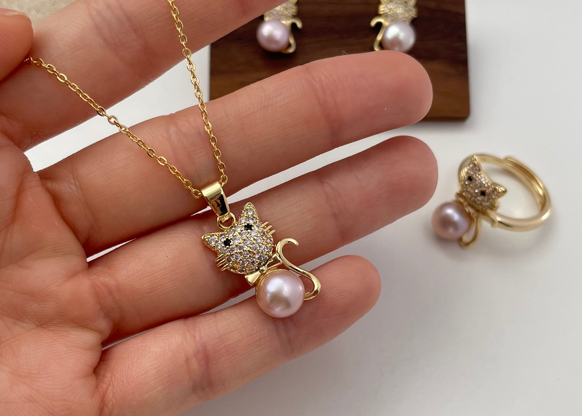Set 12 | Gold Cat with Blush Pink Pearl Jewellery Set