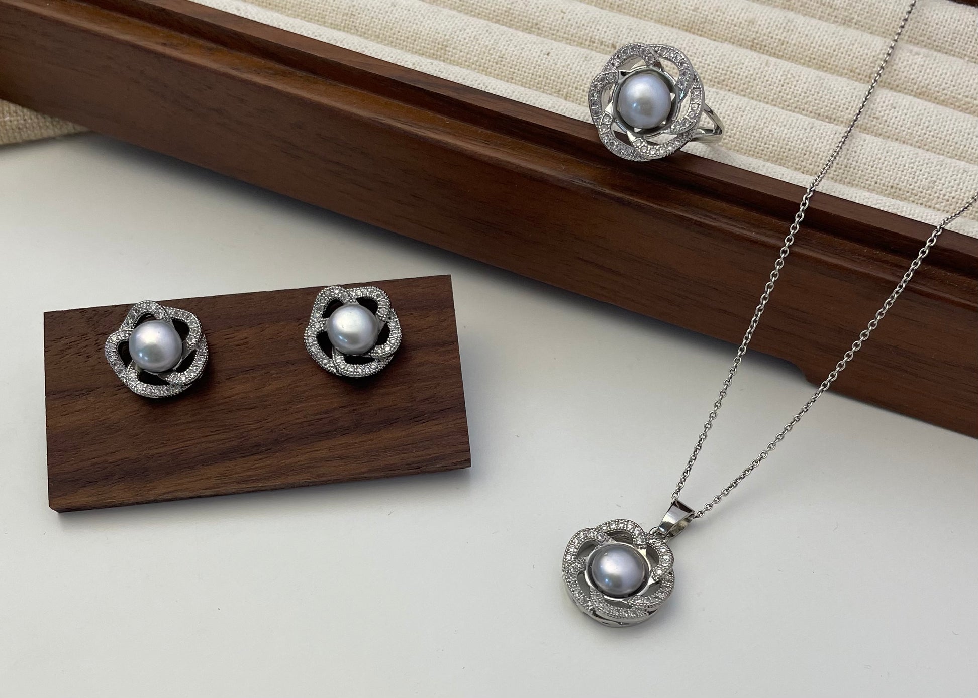 Set 16 | Silver Flower with Grey Pearl Jewellery Set