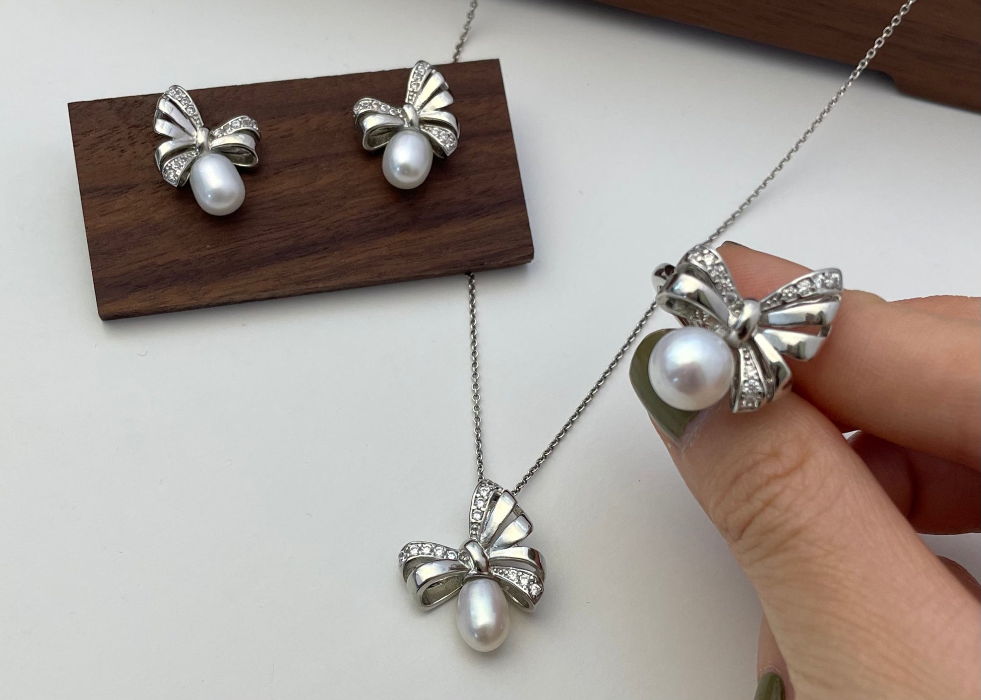 Set 20 | Silver Ribbon with White Pearl Jewellery Set