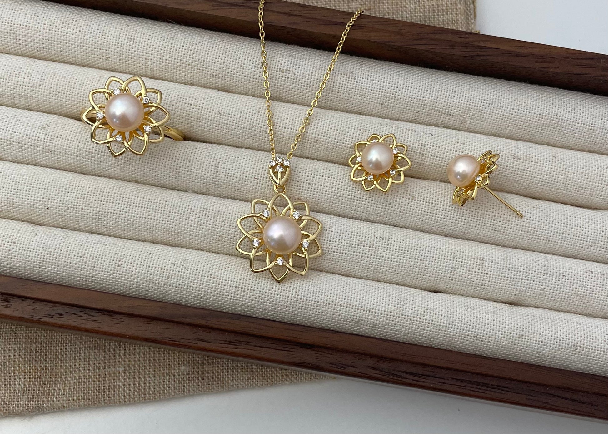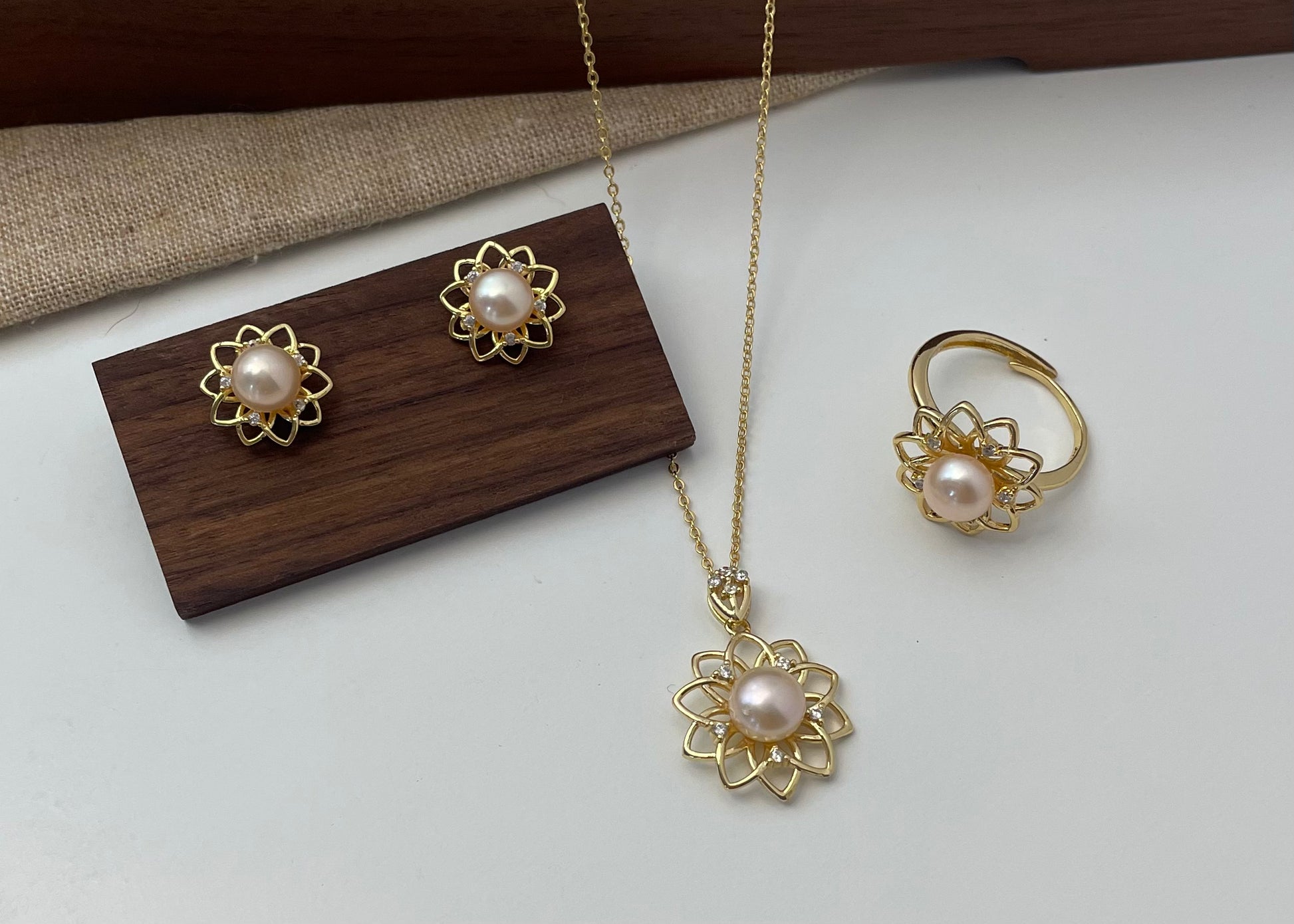 Set 33 | Gold Sunflower with Pastel Orange Pearl Jewellery Set