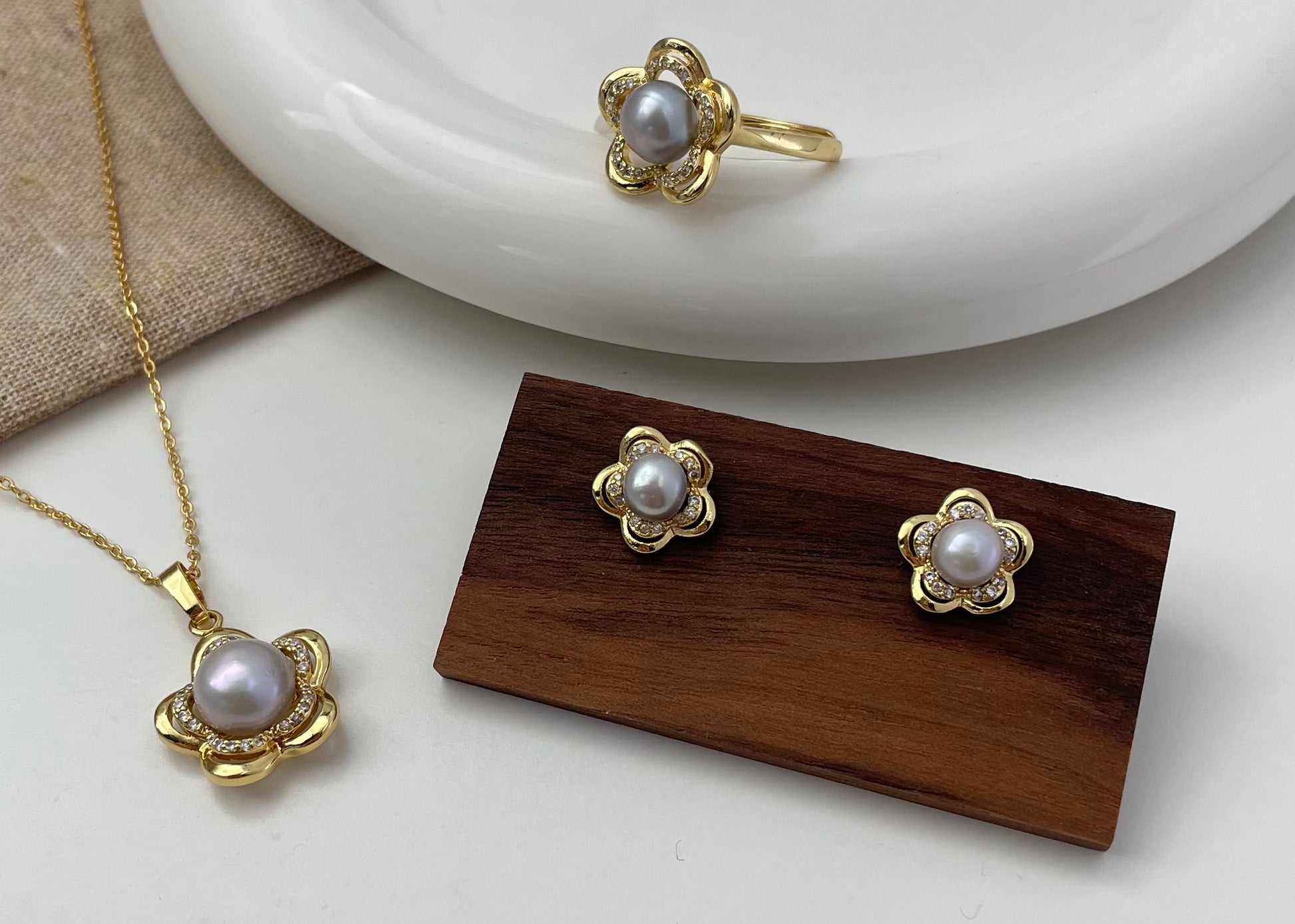Set 7 | Flower with Silver Pearl Jewellery Set