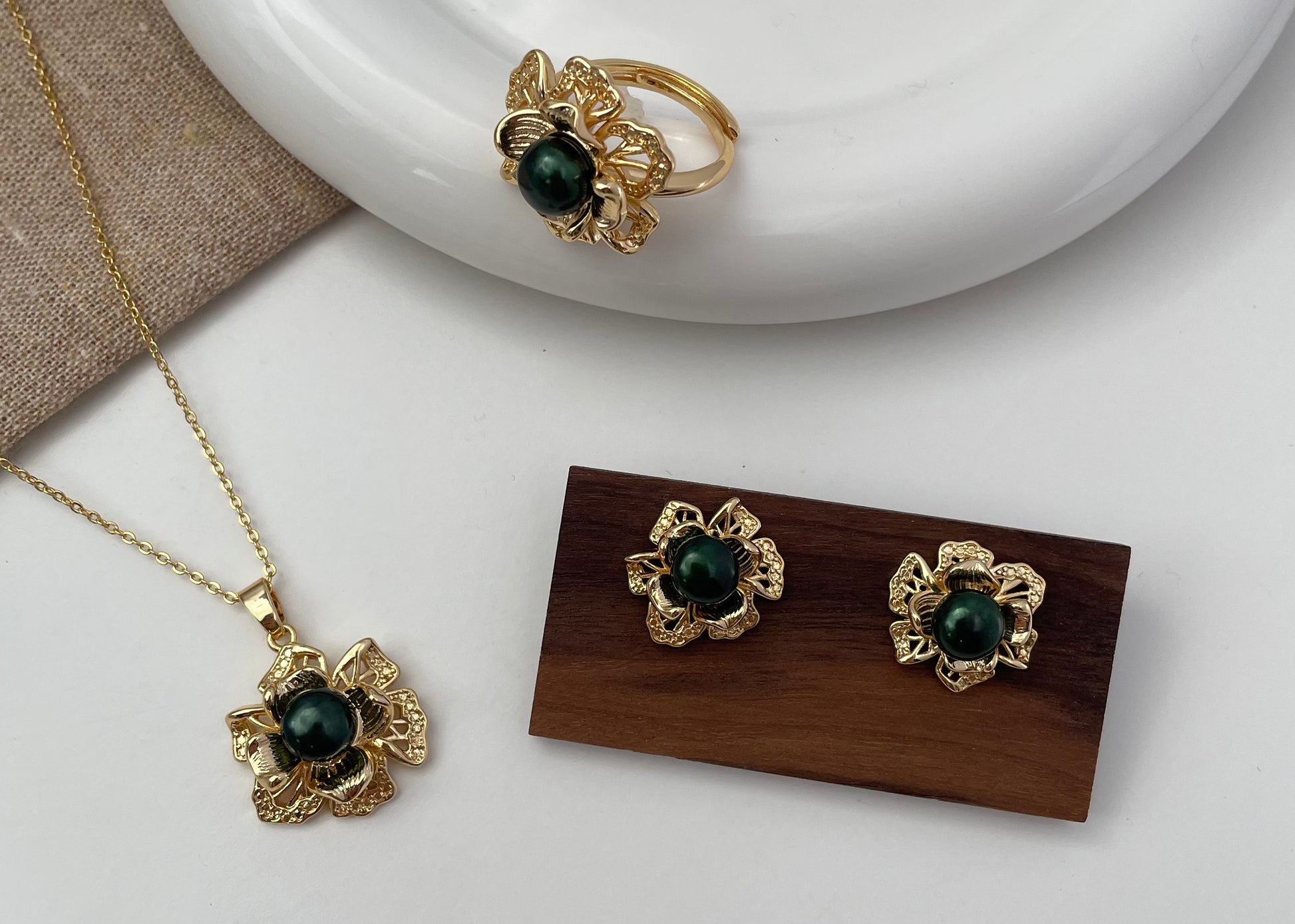 Set 8 | Vintage Flower with Green Pearl Jewellery Set