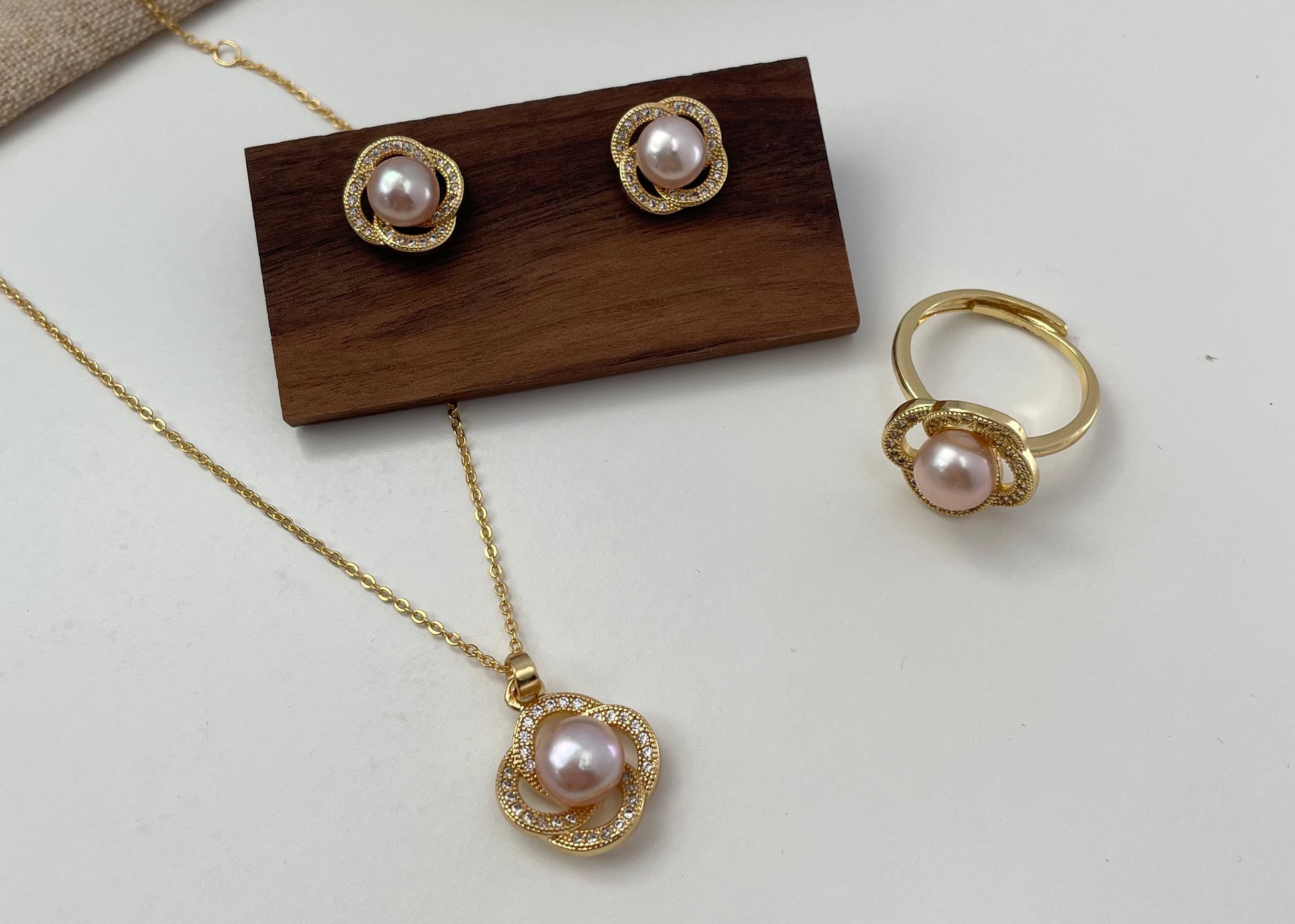 Set 9 | Gold Flower with Pink Pearl Jewellery Set